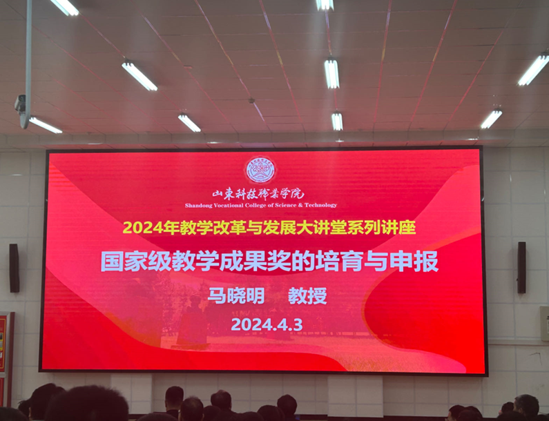 4月3日下午,学校特邀国家级教学成果特等奖及一等奖获得者、全国知名专家、原深圳职业技术学院副校长马晓明教授在厚德楼B301举办“2024年教学改革与发展大讲堂系列讲座--国家级教学成果奖的申报与培育”专题讲座。讲座由副校长张振东主持,采取线上线下相结合方式,各系部主任、副主任及专任教师、相关部门人员等300余人参加了线下讲座。