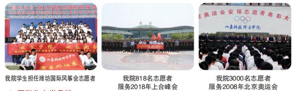 一年一届的科技文化艺术节等校园文化活动丰富多彩,培植了“新生导航工程”和“每周义工一小时”等学生工作品牌项目,近4000名大学生志愿者先后参与奥运会、世博会、武搏会、建国六十周年庆典、十一届全运会等志愿服务,818名志愿者服务上合青岛峰会,学院被评为“第八届山东省青年志愿者服务先进集体”。篮球、足球等多次夺得省级、国家级比赛冠军,跆拳道队连续9年参加全国大学生跆拳道锦标赛共获得34金13银14铜,居全国高职院校首位。学生舞狮队、武术队应邀赴德国参加“中国民俗文化节”巡演。
