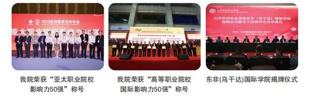 学院近年来主动服务国家“一带一路”发展战略,建有东非(乌干达)国际学院,至今已与德国、澳大利亚等17个国家的126所院校和机构建立友好合作关系。截至目前,学院与德国、韩国等高校举办了8个中外合作办学项目。近五年学院共接收来自俄罗斯、印度、巴基斯坦等25个国家的来华留学生1000余名,80%以上来自于“一带一路”沿线国家。学院是全国高职五所之一、山东高职唯一的国家海外考试中心,设有托福、GRE、韩语TOPIK、日语JLPT、英国剑桥BEC、国际IT等多个海外考点,为学生、社会人员参加海外考试提供服务。