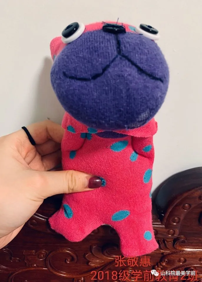 袜子小狗布偶的制作选用材料为一双旧袜子、彩色线和棉花填充物。加上自身对小狗可爱化的理解进行改造,添加小狗的领子。虽然对针线活儿还不太熟练,但看到自己亲自做的袜子小狗布偶深受妹妹的喜爱,我也感到了快乐和幸福。