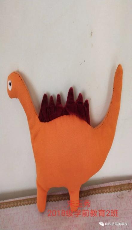 手工小恐龙是采用废弃衣服制作而成,首先用纸壳模板画出模型,再按照模型进行剪裁。黄色的恐龙身和它红色的犄角都使它显的跟色彩突出,使小恐龙更能吸引眼球,突现可爱。