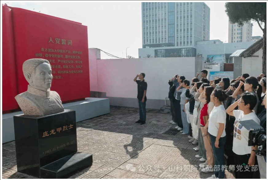 庄龙甲同志是潍坊地区党组织的创始人和早期主要领导人。在庄龙甲烈士塑像前,全体党员庄严列队,面对党旗重温入党誓词,以铿锵誓言表达坚守初心、勇担使命的坚定信念。